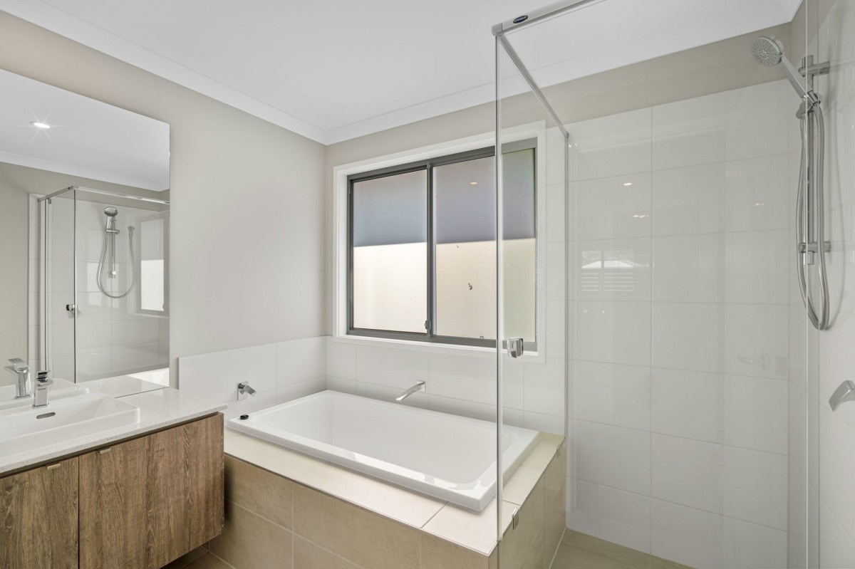 - Main bathroom with ample vanity storage, large shower cavity, and separate bathtub.