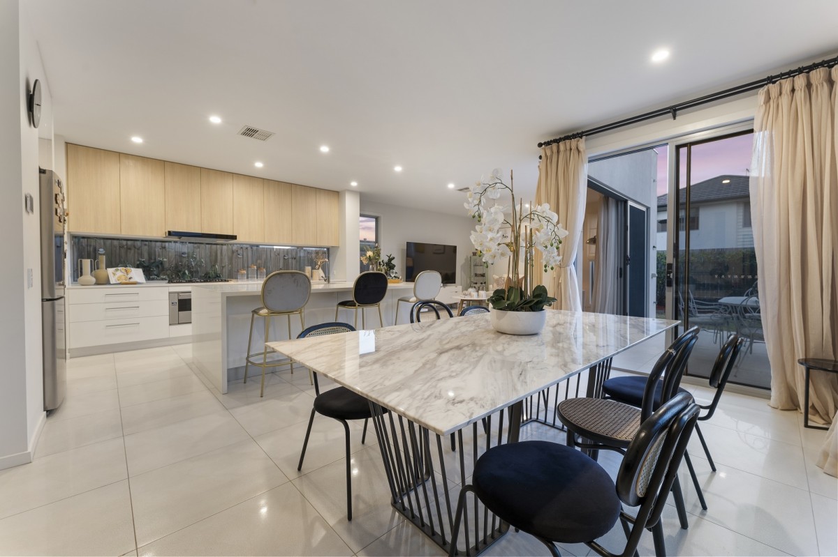 At the heart of the home, a sleek open-plan kitchen is both elegant and functional. Enjoy cooking with stone benchtops, quality stainless steel appliances, gas cooking, a generous walk-in pantry, and ample storage space. The kitchen seamlessly integrates with the light-filled living and dining zones-enhanced by high ceilings and large-format porcelain tiles-before opening to a private, covered portico ideal for alfresco entertaining.