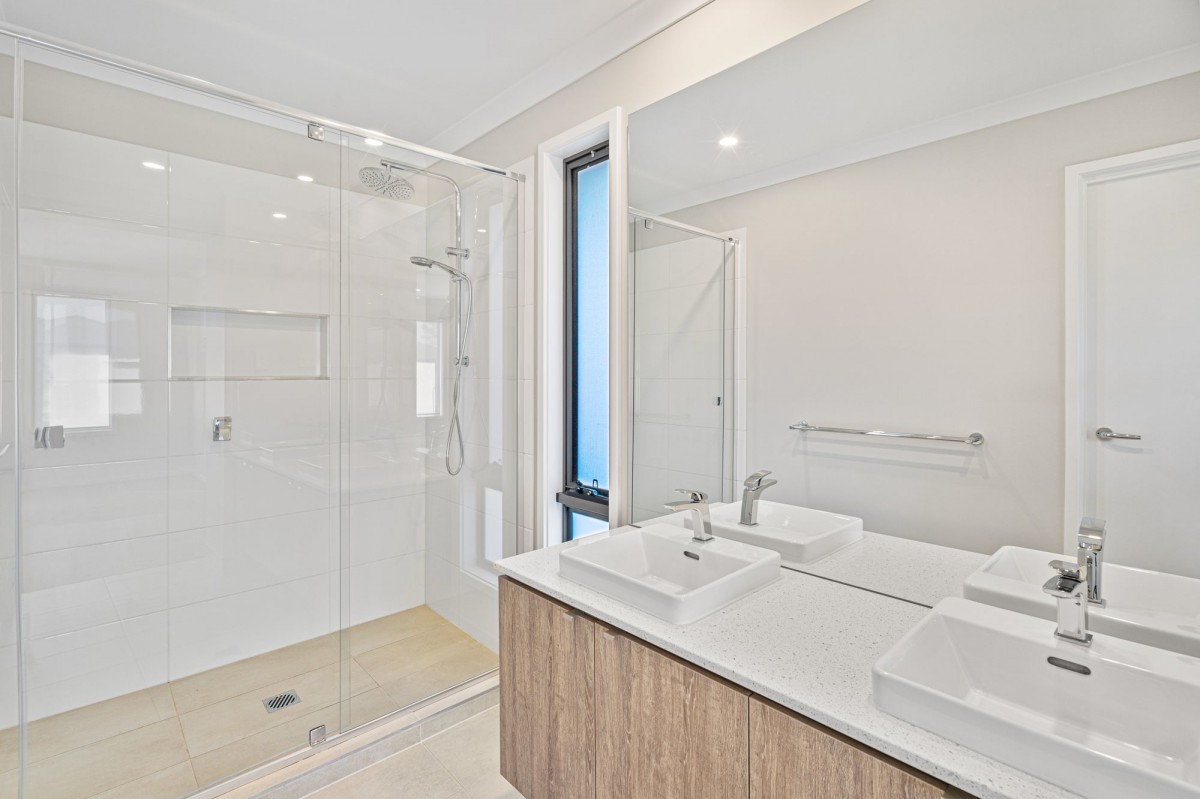 - Main bathroom with ample vanity storage, large shower cavity, and separate bathtub.