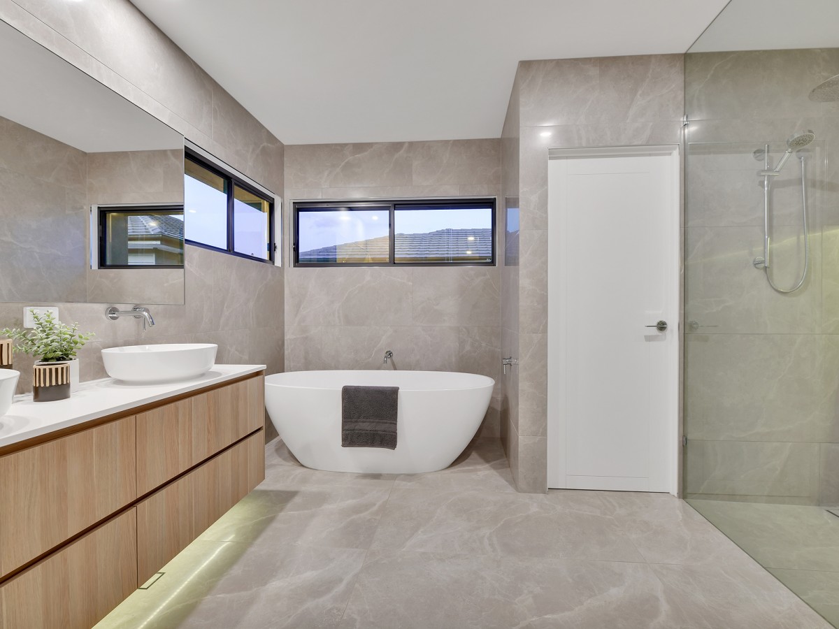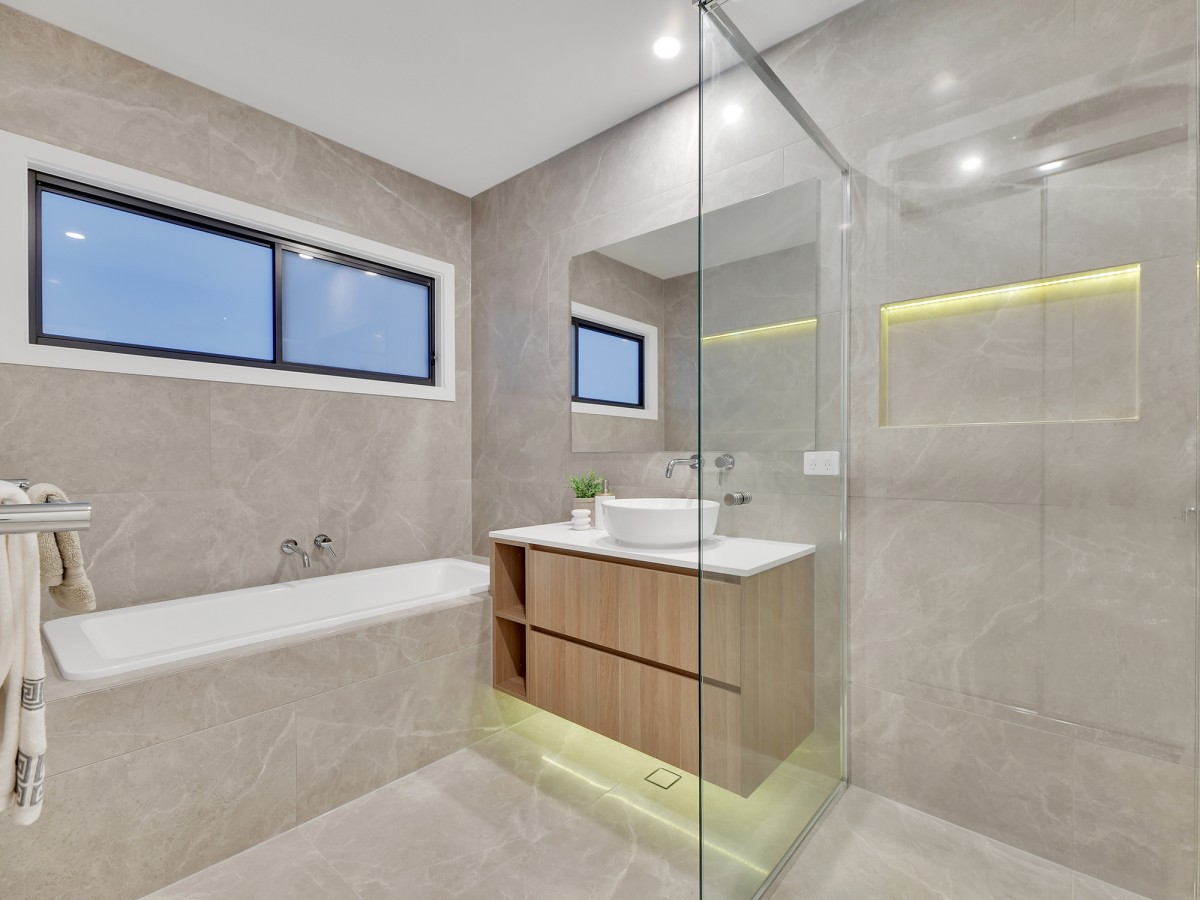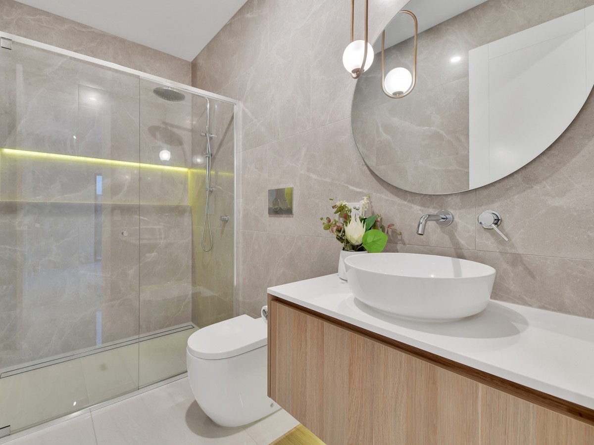 An additional shared bathroom continues the same high-end aesthetic, featuring full-height tiling, a large shower, and a wide vanity.