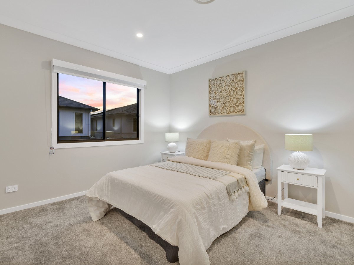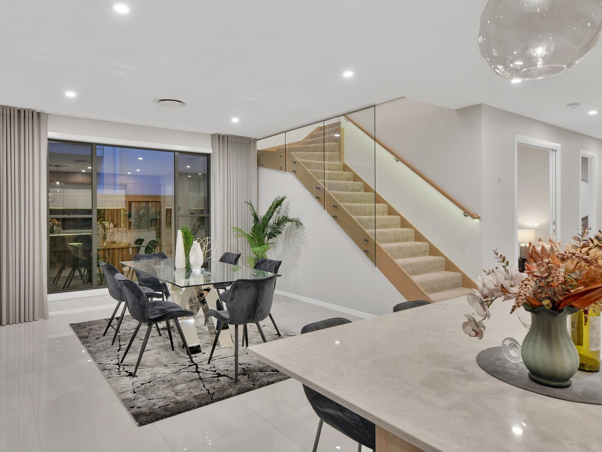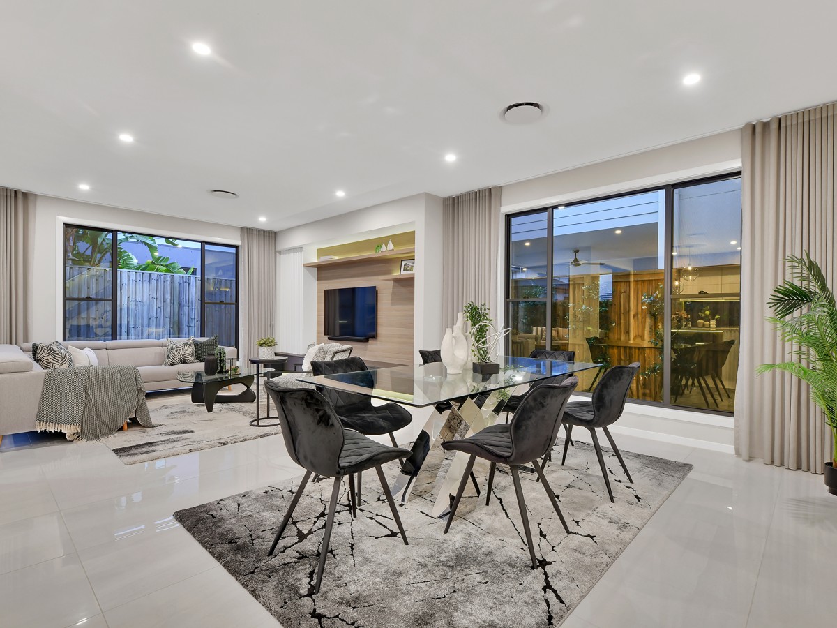 A sleek front porch welcomes you into a spectacular foyer, where shining tiles and crisp white walls reveal the home's sense of refinement. The open-plan lounge and dining area are enhanced with floor-to-ceiling curtains, dazzling downlights, and custom timber joinery, creating a seamless flow for everyday living and entertaining.