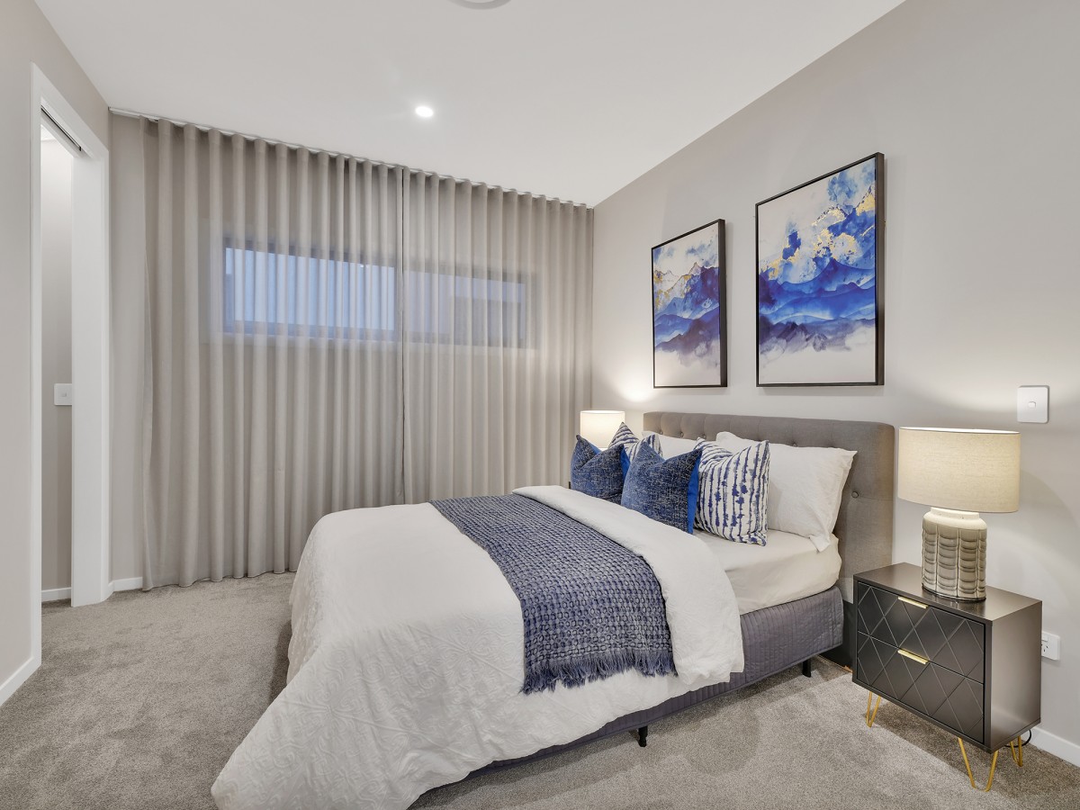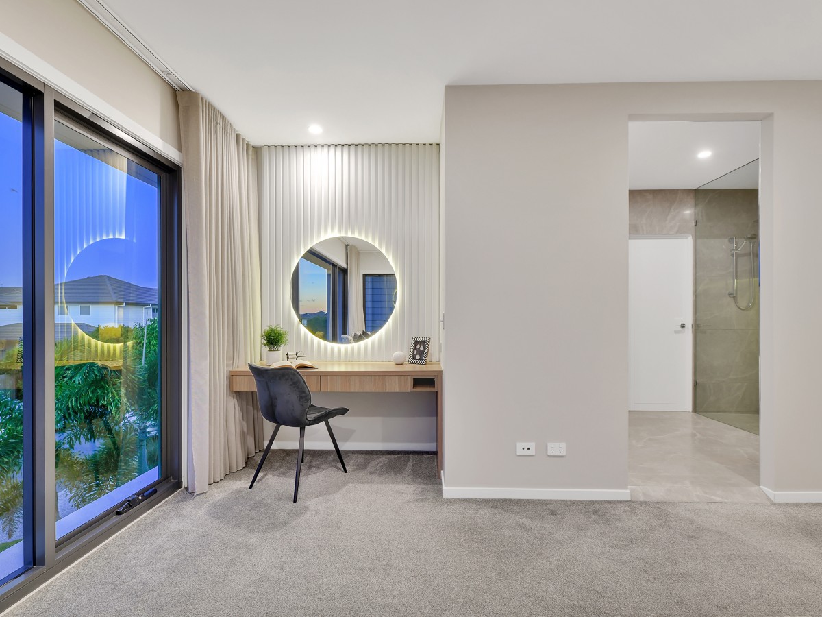 The master suite is a true statement of luxury - expansive and versatile, with a private sitting area or study nook, a massive walk-through robe with bespoke timber joinery, and a breathtaking ensuite reminiscent of a high-end spa. The ensuite showcases floor-to-ceiling stone-look tiles, a freestanding bathtub, double vanity with stone benchtop, and a rainfall shower, creating the perfect indulgent escape.