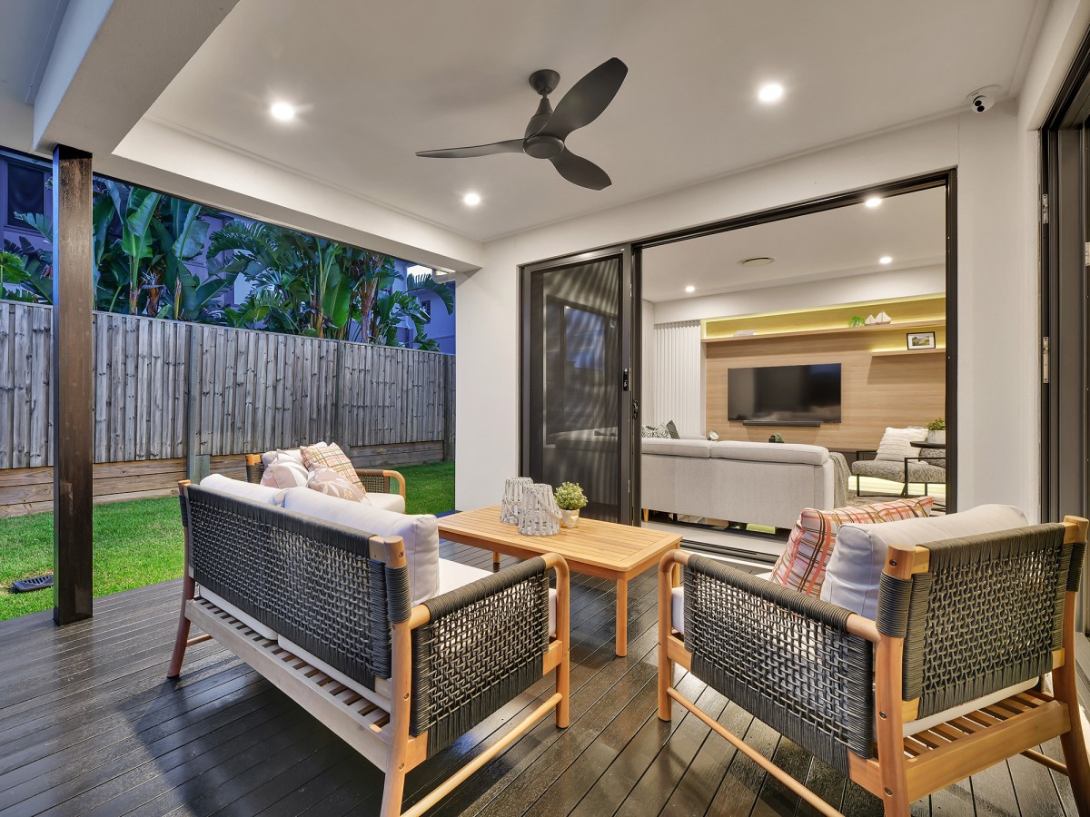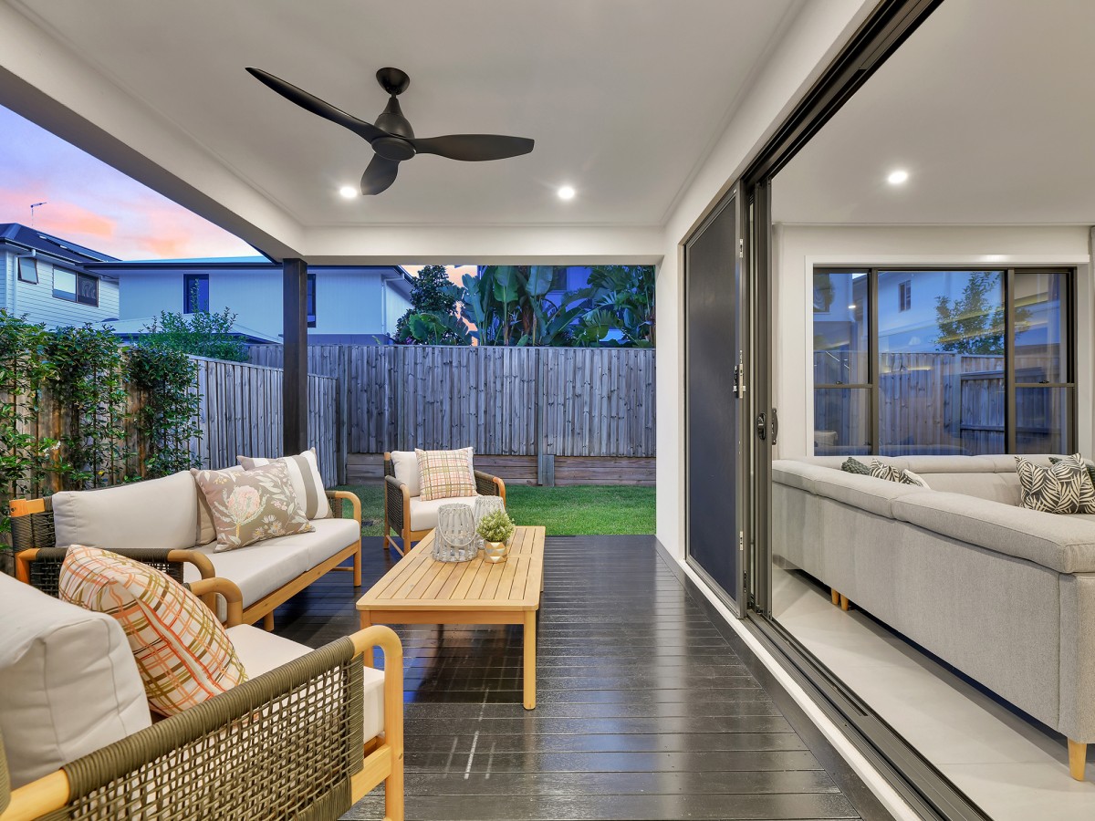 Outside, the fully fenced and easy-care backyard offers a private sanctuary for gatherings and relaxation. The expansive patio is fully decked and complemented by a chic black ceiling fan and feature lighting - perfect for alfresco dining or quiet evenings. Surrounded by lush greenery and manicured lawns, it's a haven where children and pets can play freely.
