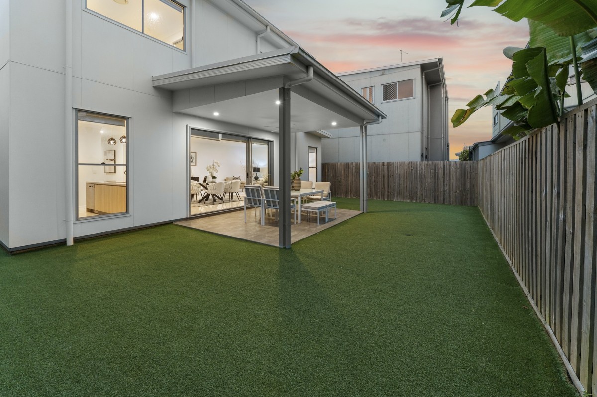 Large sliding doors link the interior to the covered alfresco, extending the living zone outdoors and creating a seamless environment for gatherings of all sizes. The backyard features lush, maintenance-free landscaping, offering a private space for families to relax, play or entertain without the usual upkeep.