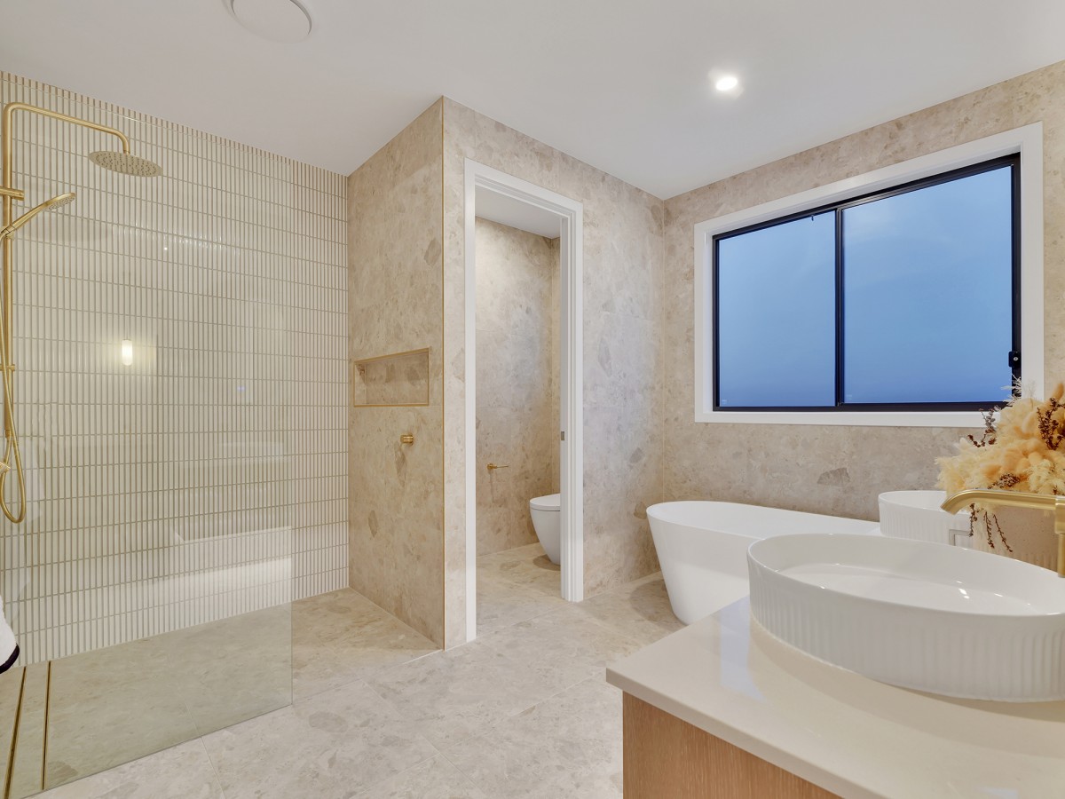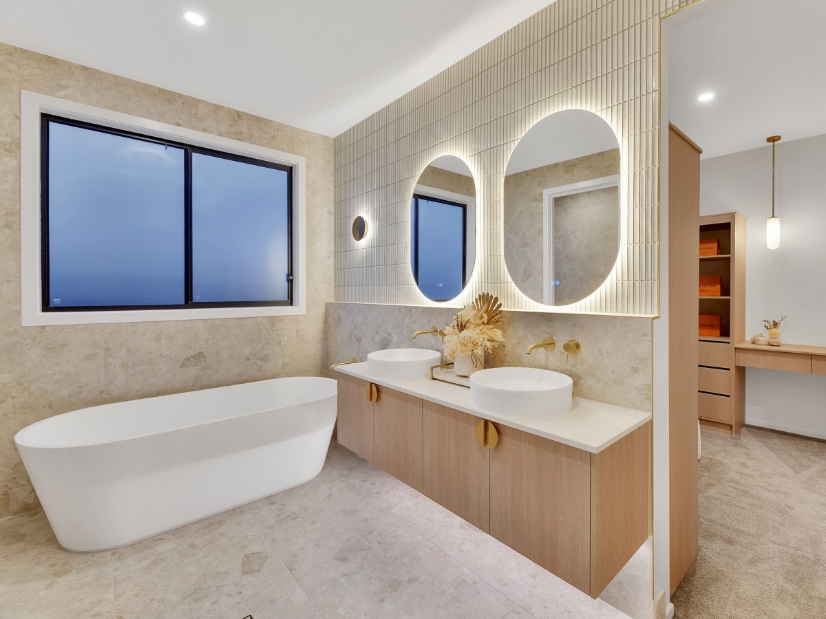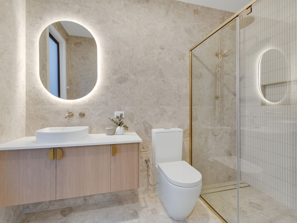 -Five designer bathrooms, all with LED backlit mirrors, custom vanities, floor-to-ceiling tiling, and premium tapware