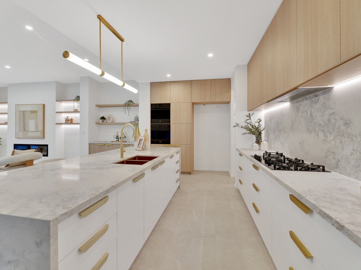 -High-end kitchen with European appliances, oversized stone island bench, gas cooking, and soft-close custom cabinetry