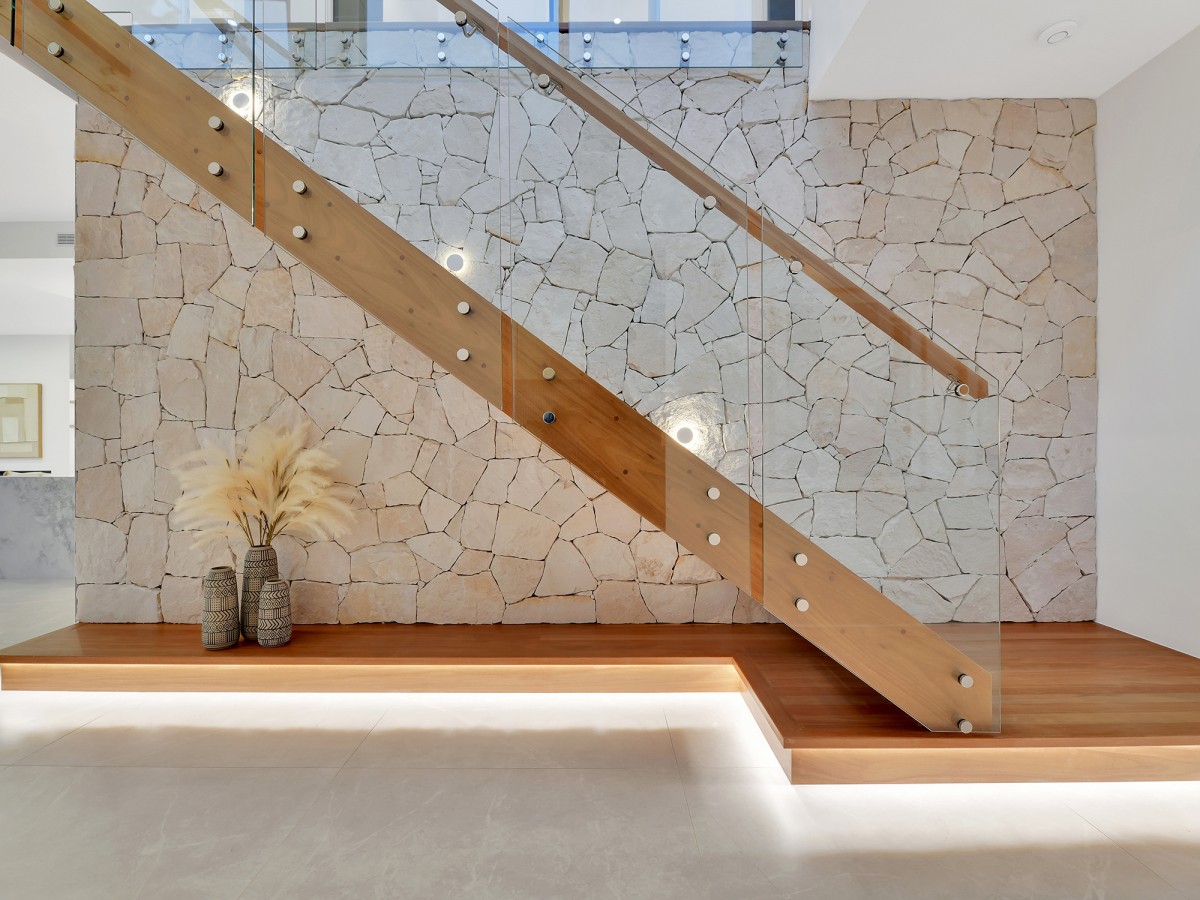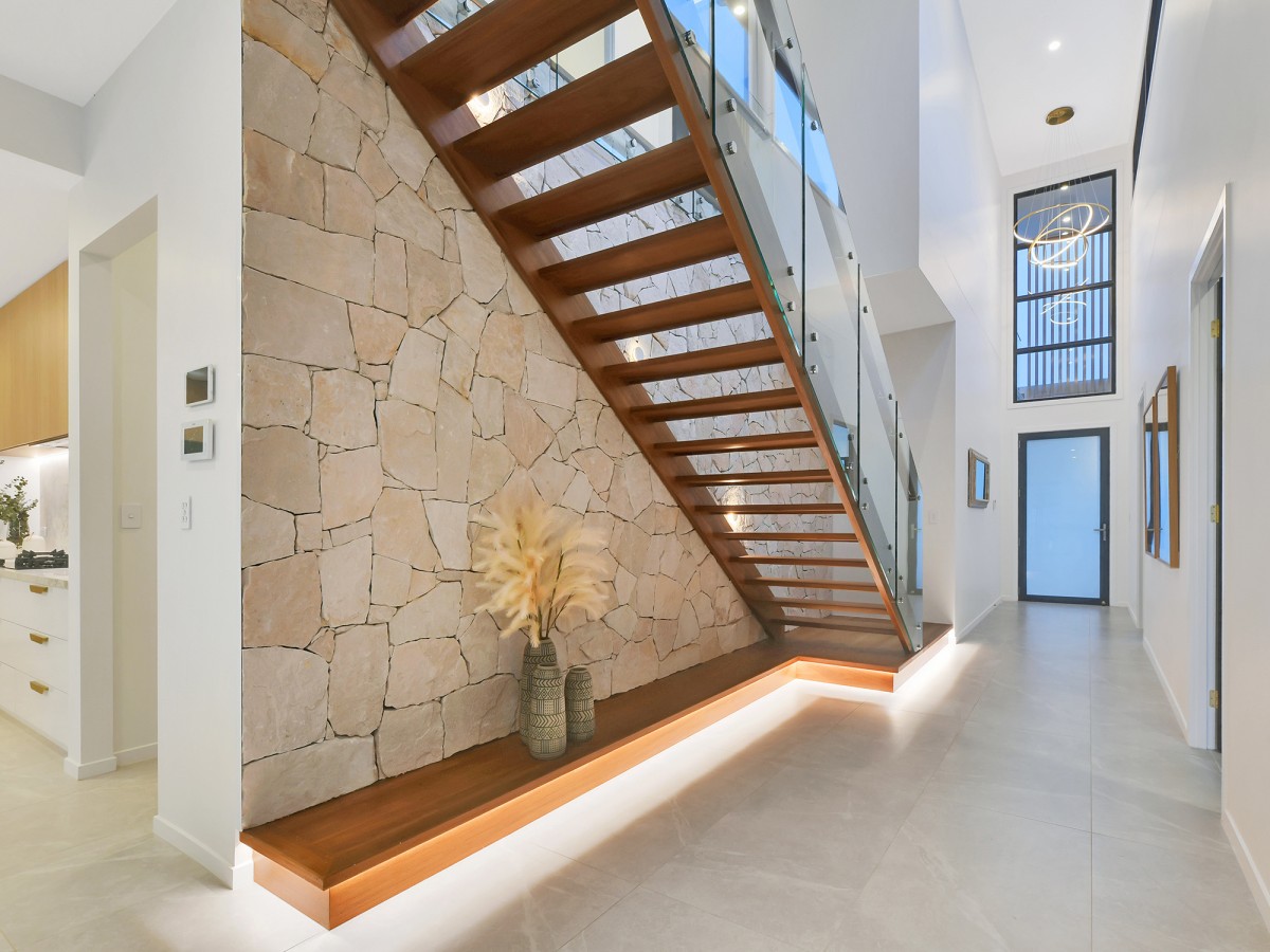Step through the oversized entryway to find large format tiles underfoot, a designer staircase with a glass balustrade and feature stone wall, and ambient LED lighting that enhances every detail.