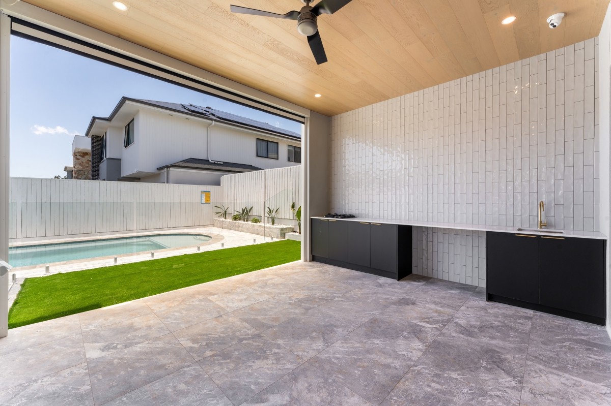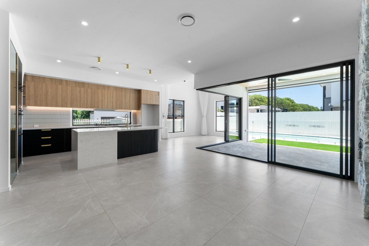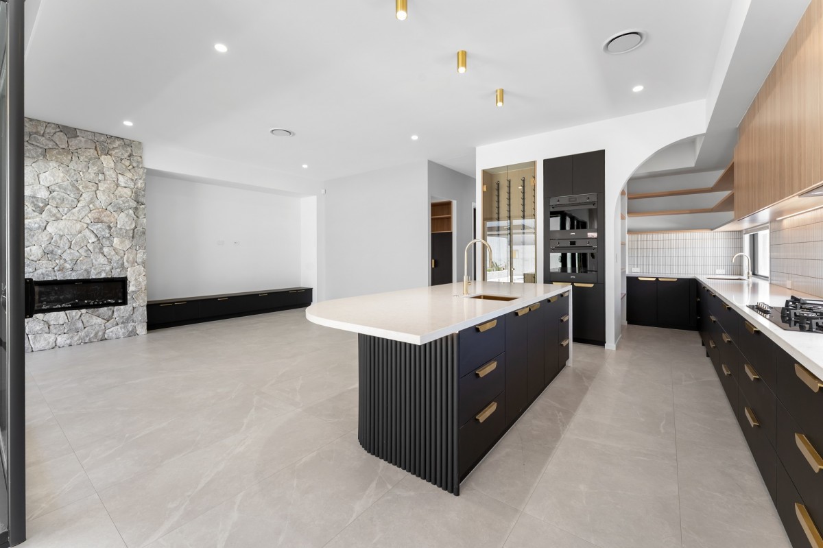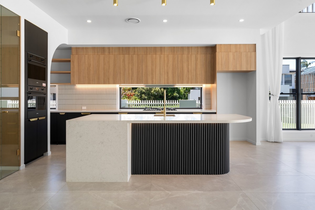 From the moment you step through the wide entry, the home reveals its impressive scale. Full-height voids flood the living areas with natural light, while the seamless connection between the kitchen, dining, living and alfresco zones creates a sense of effortless flow. The designer kitchen is a true centrepiece, finished with a sculpted stone island, premium appliances, fluted joinery, window splashback, walk-in pantry and warm timber cabinetry. Overlooking both the pool and the living areas, it is crafted for families who love refined everyday living and grand entertaining.