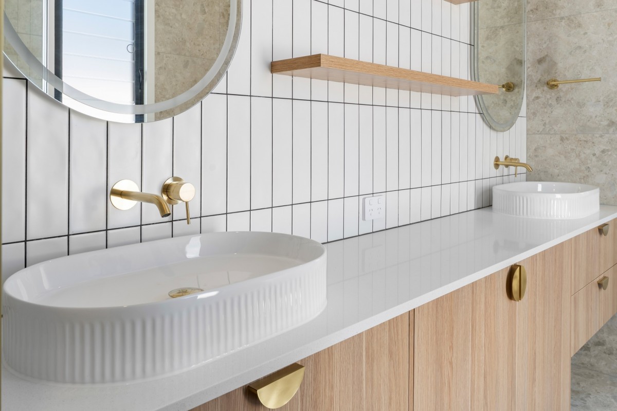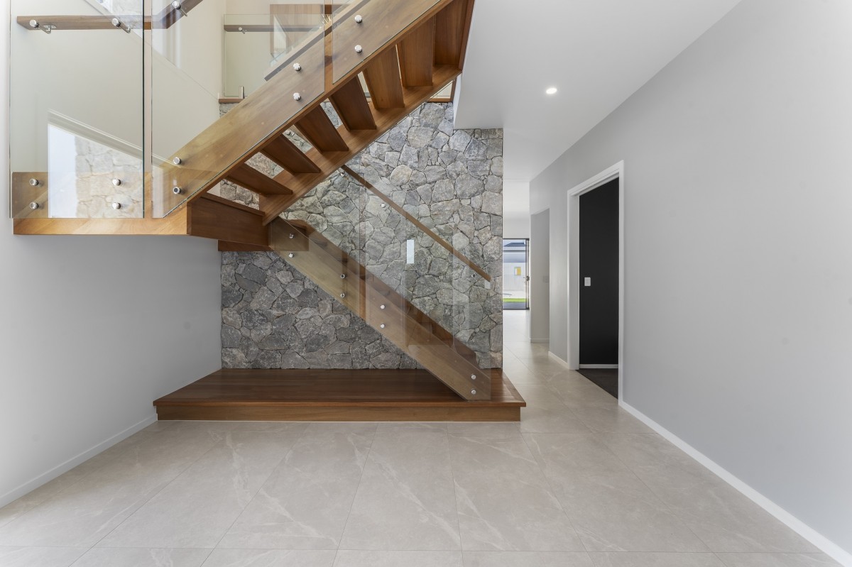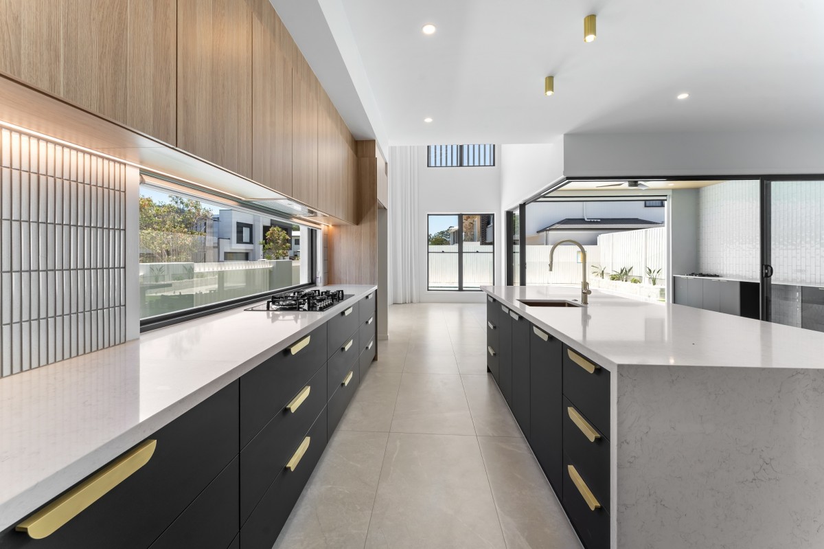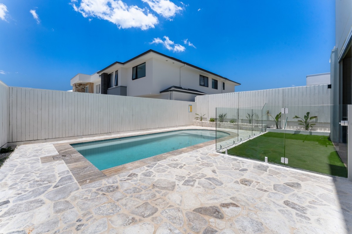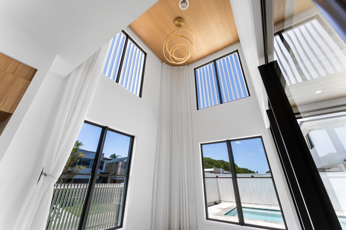From the moment you step through the wide entry, the home reveals its impressive scale. Full-height voids flood the living areas with natural light, while the seamless connection between the kitchen, dining, living and alfresco zones creates a sense of effortless flow. The designer kitchen is a true centrepiece, finished with a sculpted stone island, premium appliances, fluted joinery, window splashback, walk-in pantry and warm timber cabinetry. Overlooking both the pool and the living areas, it is crafted for families who love refined everyday living and grand entertaining.