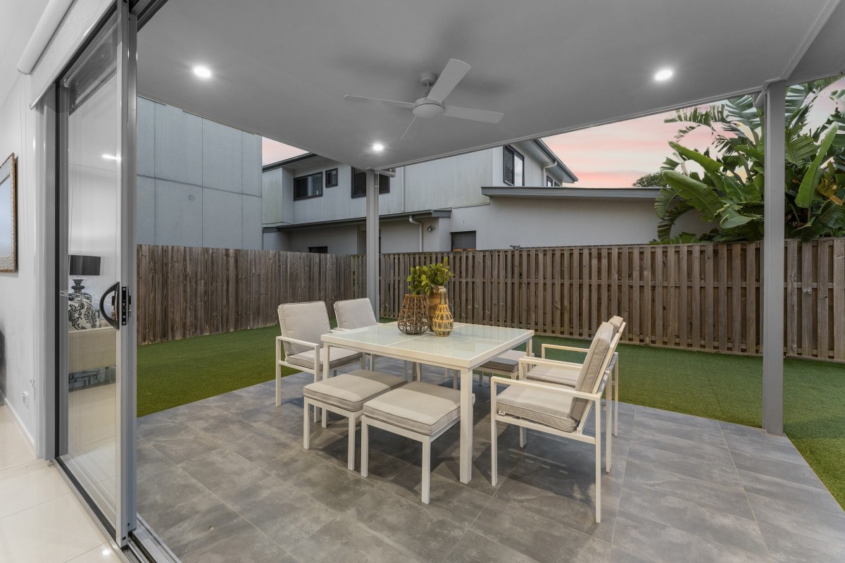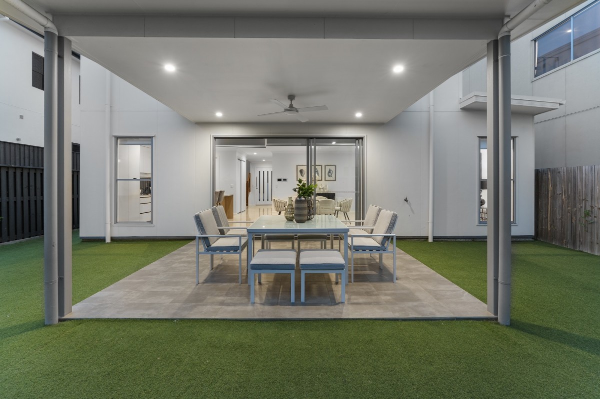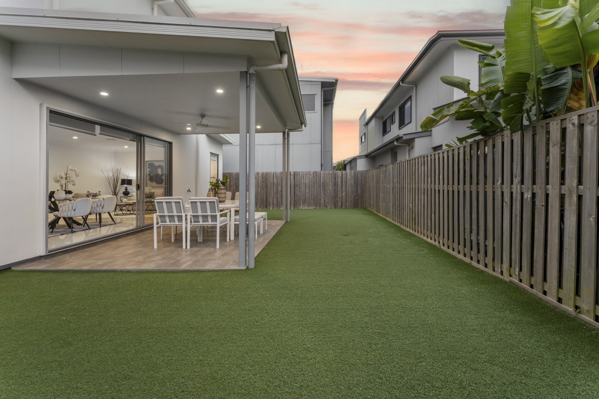 Large sliding doors link the interior to the covered alfresco, extending the living zone outdoors and creating a seamless environment for gatherings of all sizes. The backyard features lush, maintenance-free landscaping, offering a private space for families to relax, play or entertain without the usual upkeep.