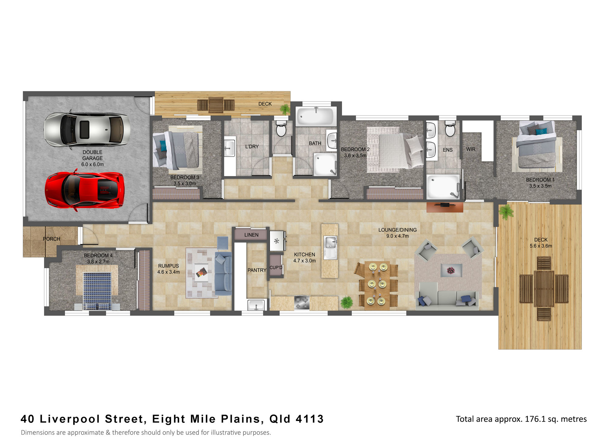 Throughout the home are four spacious bedrooms with built in wardrobes. The master bedroom features the luxury of a stunning ensuite with an open shower and frameless glass shower screen.
