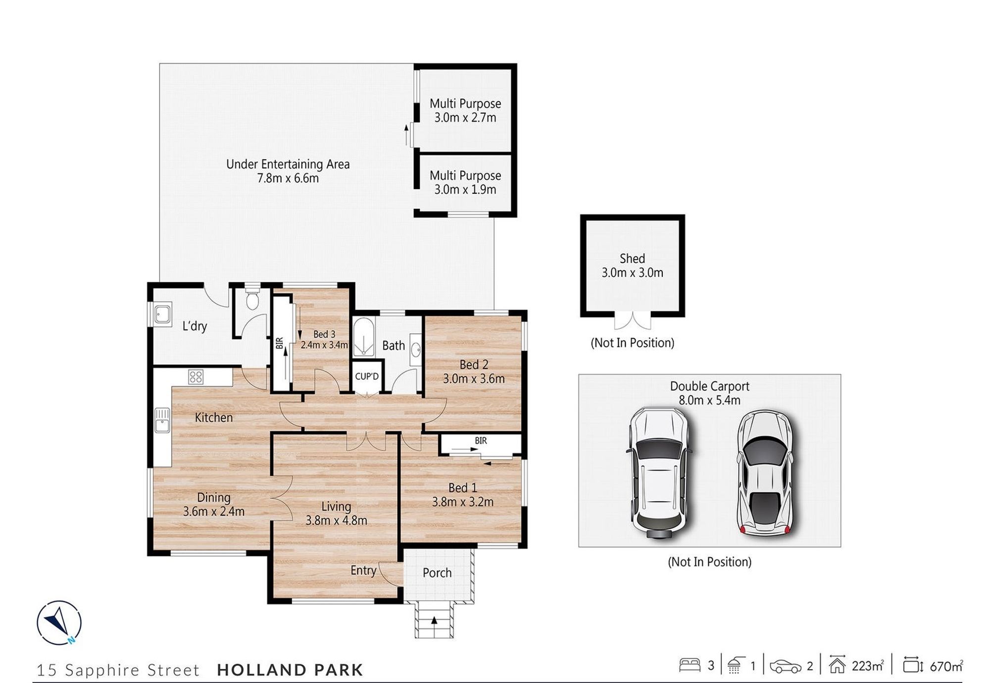 Large space carport, newly timber floors, storage rooms.