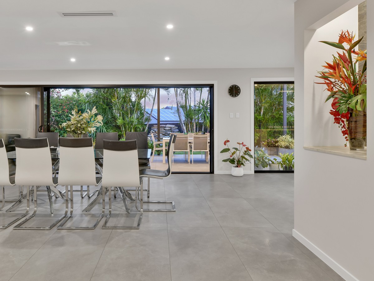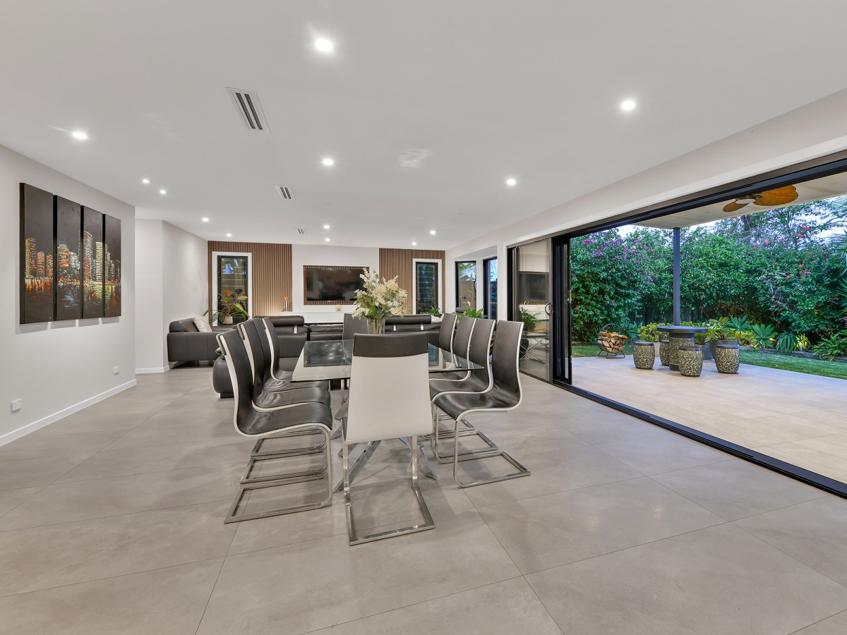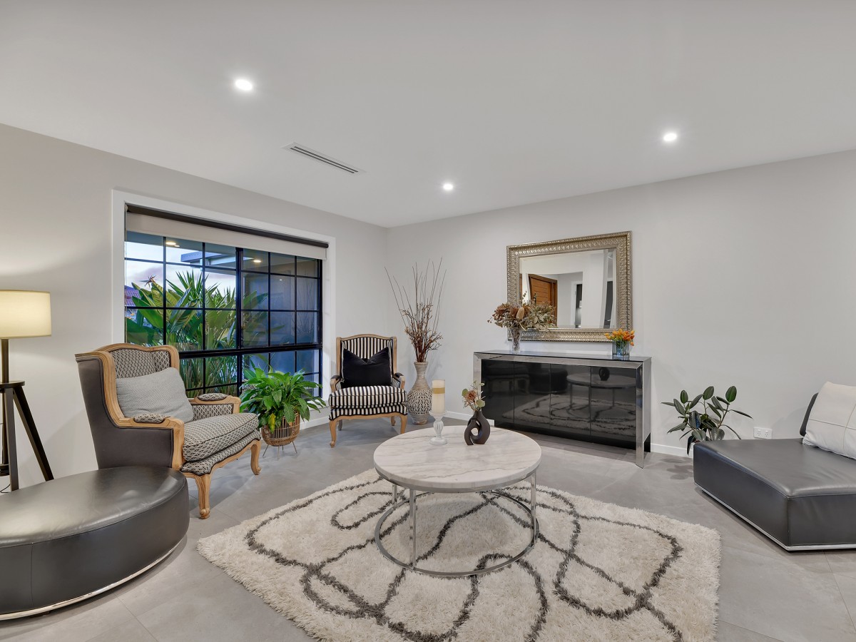 Multiple living zones provide flexibility for family comfort and entertainment. The formal lounge offers a refined retreat, while the open-plan living and dining area connects effortlessly to the alfresco via a 5.4 metre sliding door, creating a spectacular indoor-outdoor experience overlooking the 60,000 L salt-water pool complete with cold and hot outdoor shower.