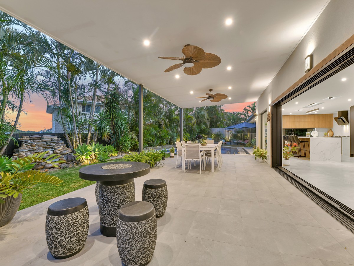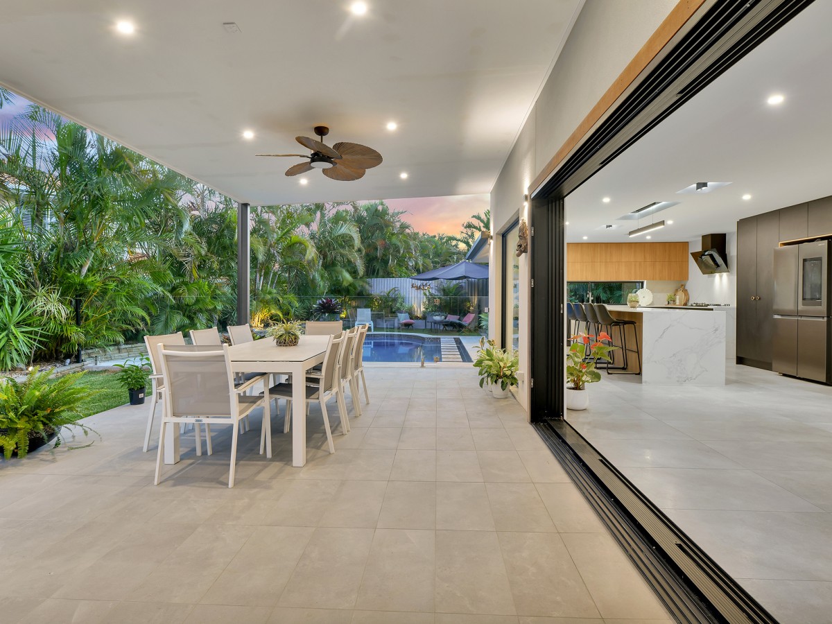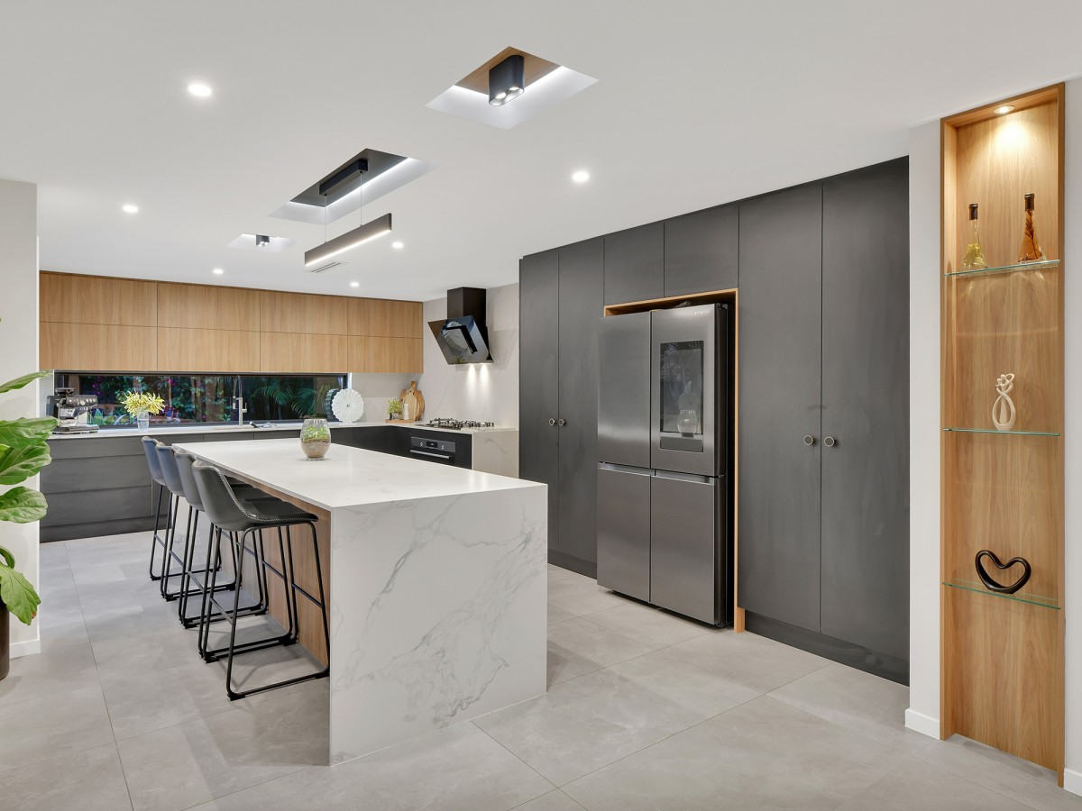 Multiple living zones provide flexibility for family comfort and entertainment. The formal lounge offers a refined retreat, while the open-plan living and dining area connects effortlessly to the alfresco via a 5.4 metre sliding door, creating a spectacular indoor-outdoor experience overlooking the 60,000 L salt-water pool complete with cold and hot outdoor shower.
