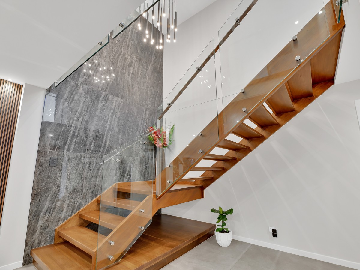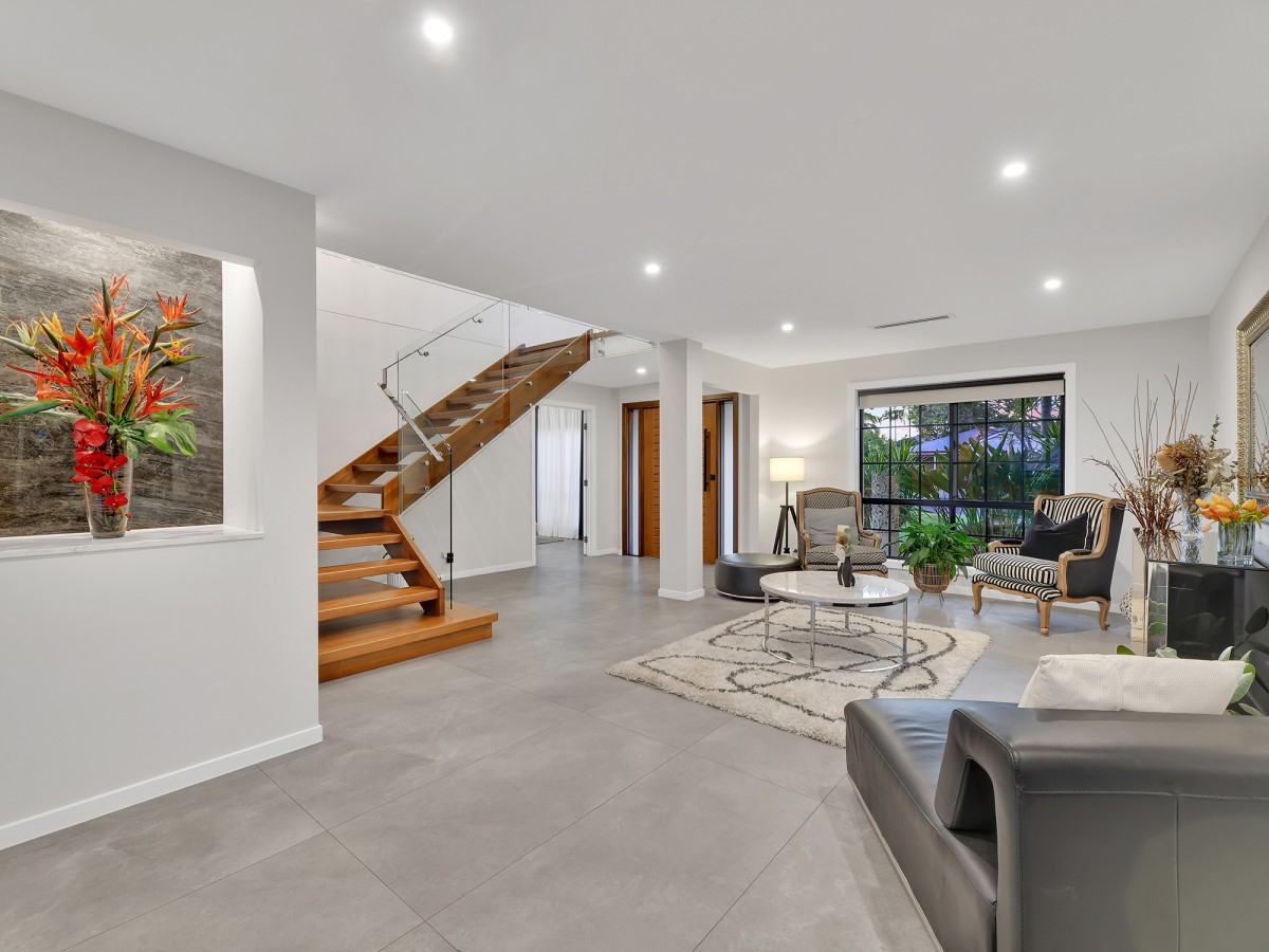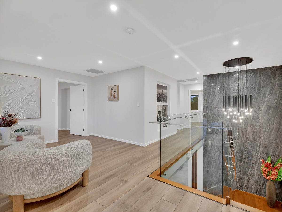 Commanding attention with its striking facade, manicured landscaping, and stone-detailed driveway, the home opens through a dramatic double-height entry framed by glass balustrades and feature pendant lighting. The interior immediately exudes refinement - porcelain tiles throughout the lower level, soaring ceilings, and abundant natural light creating a seamless flow between grand entertaining and everyday living.