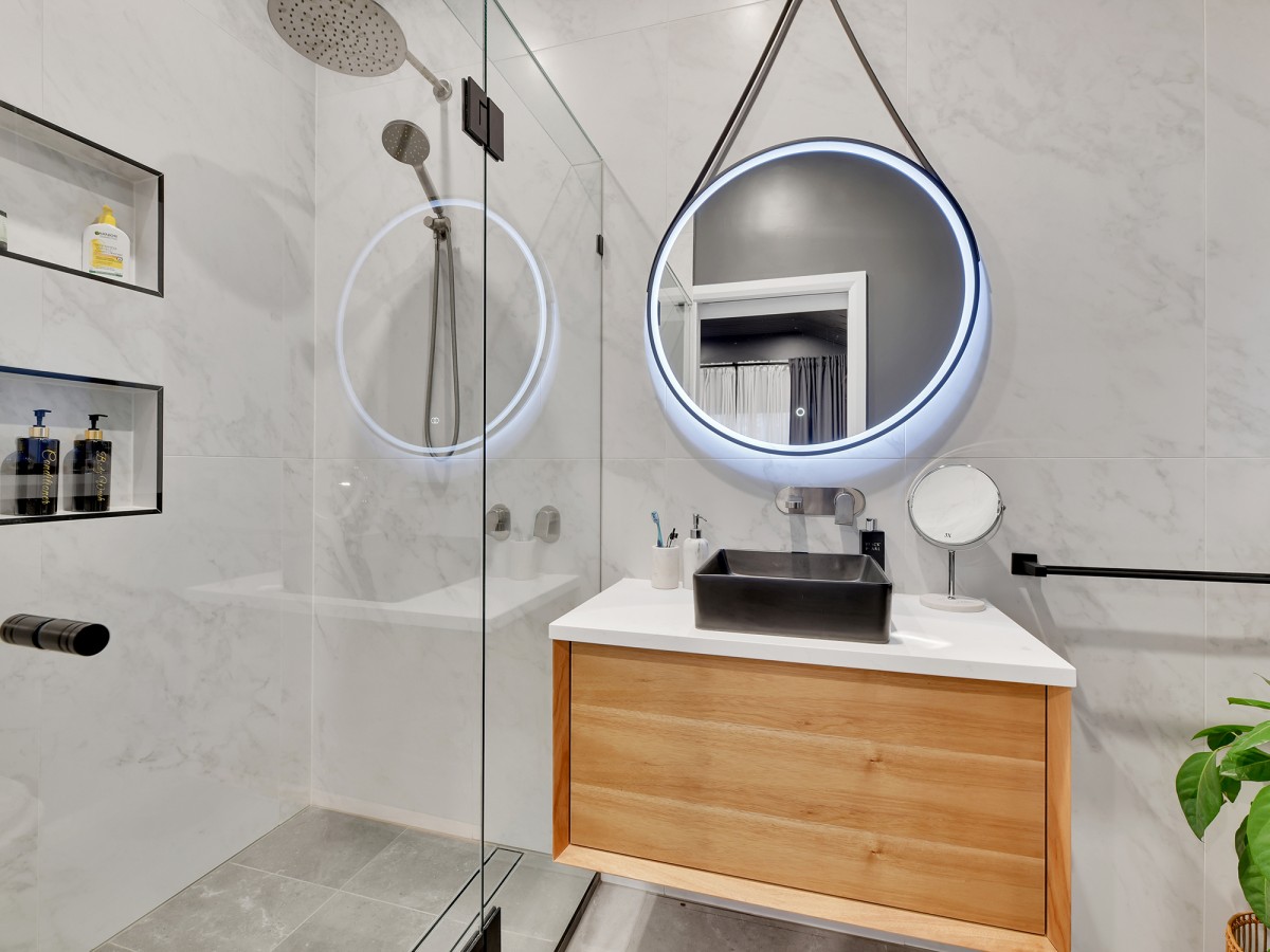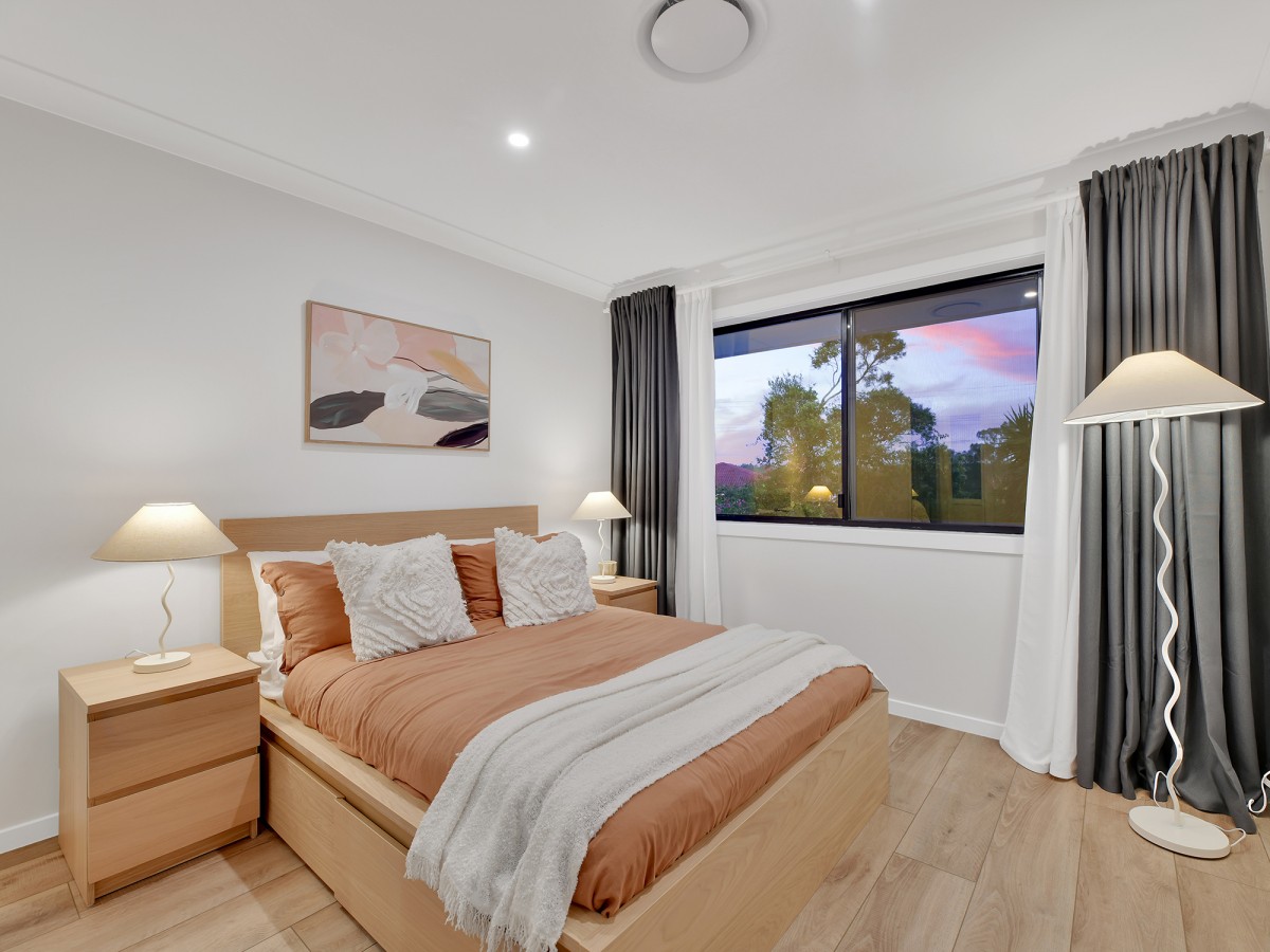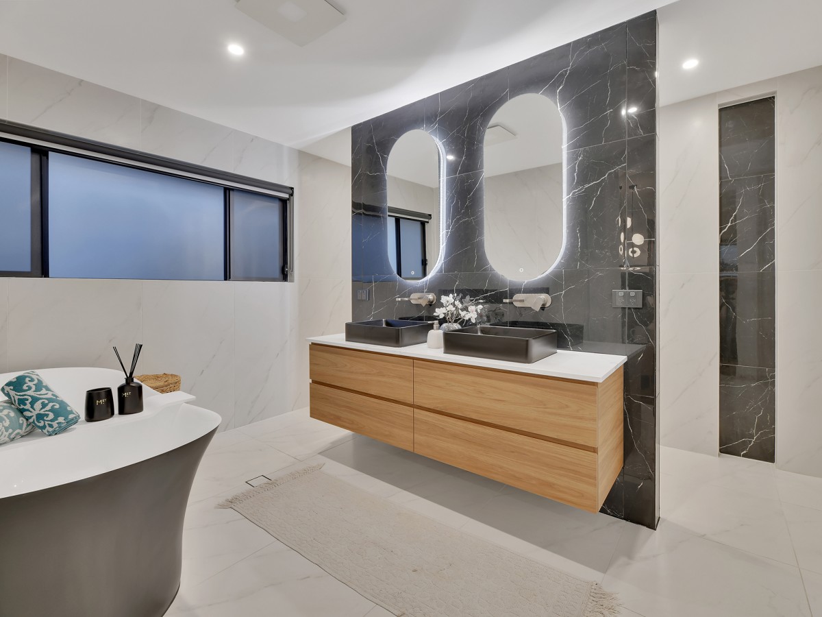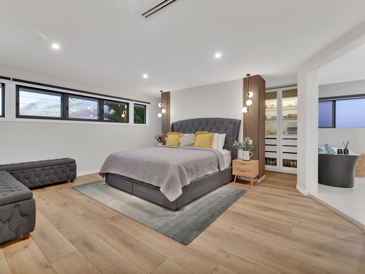 Upstairs, a versatile second living area offers an ideal family retreat. The master suite is a statement of opulence, featuring a fully custom walk-in wardrobe with glass cabinetry and a luxe ensuite with freestanding bath, LED mirrors, and a black-marble feature wall. Five additional bedrooms come with built-in robes, complemented by beautifully appointed bathrooms, one with a skylight for natural illumination.