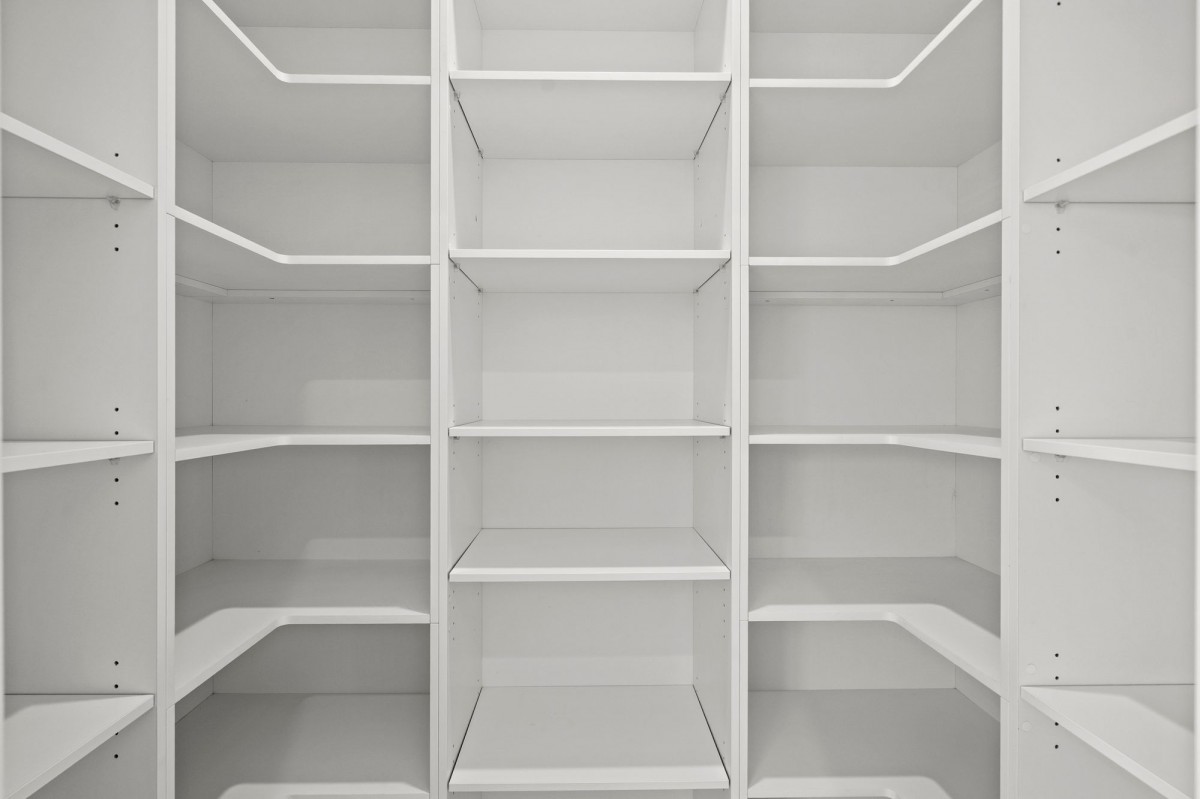 -Modern kitchen with stainless-steel appliances & walk-in pantry