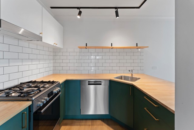 Modern kitchen with gas cooktop, oven, dishwasher, and ample storage