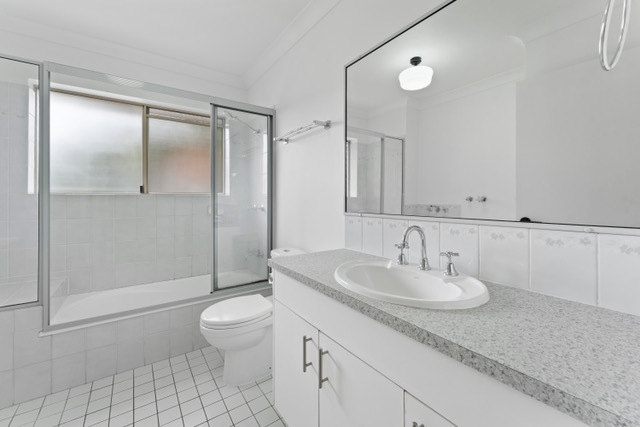 Main bathroom with combined shower/bath, toilet, vanity, and internal laundry