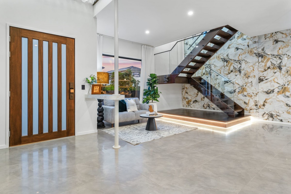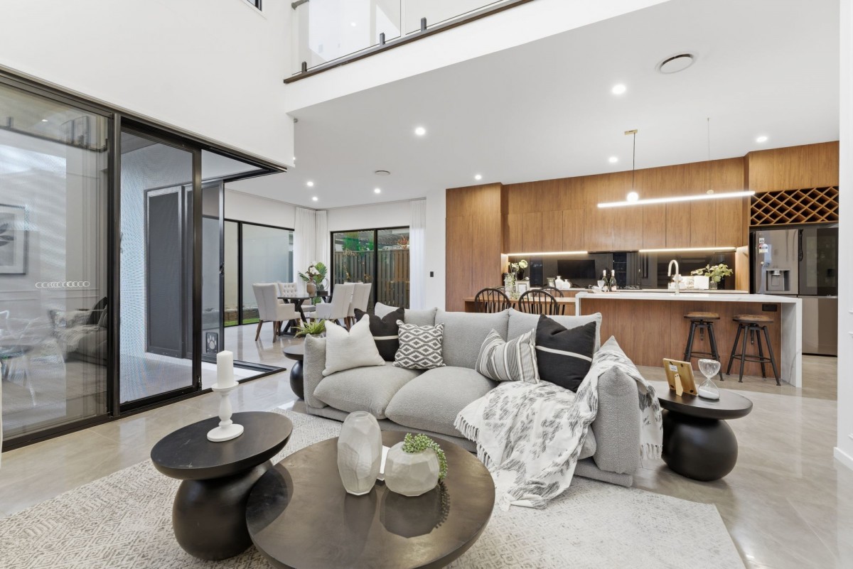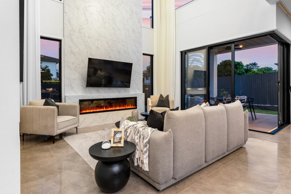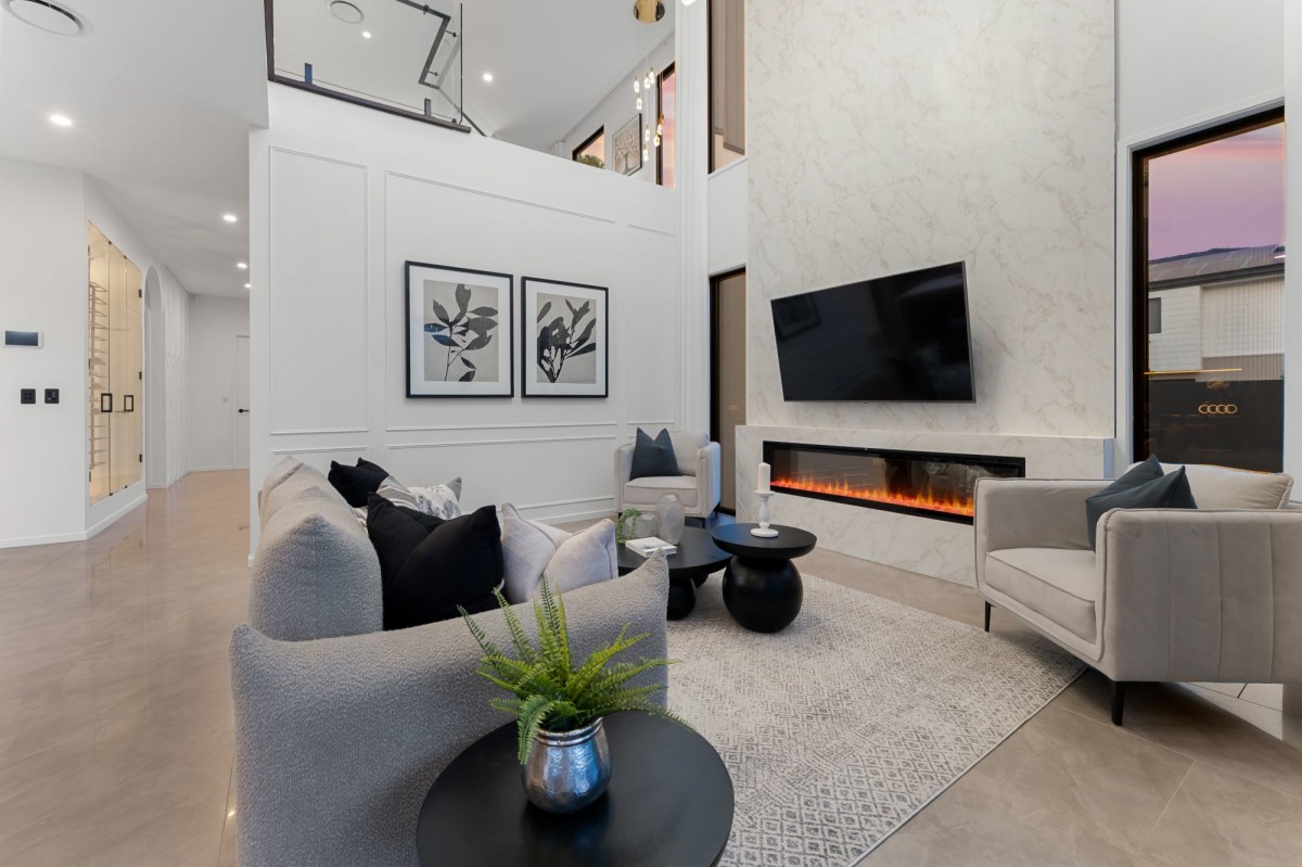 The heart of the home features a sprawling void in the living area, accentuating the sense of space and luxury. A cozy ambiance is effortlessly achieved with an electric fireplace, perfect for intimate gatherings.